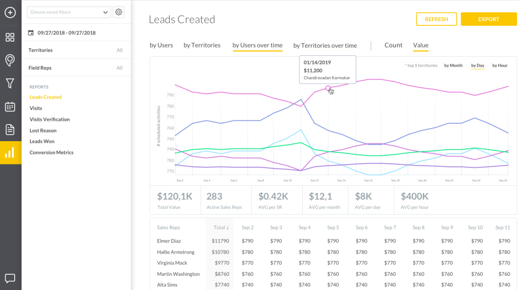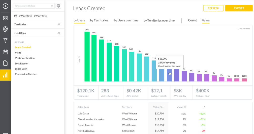 Tools like SPOTIO make it super easy to analyze individual rep performance. For example, you can use our platform to view each rep’s pool of leads, where said leads are in the sales funnel, and how long it will likely take them to close.